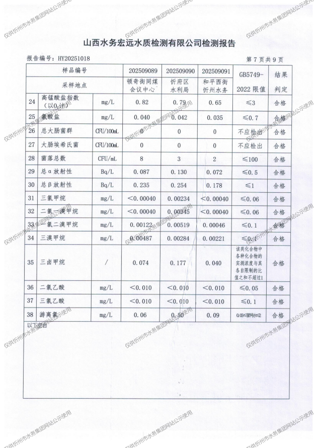 忻州城區(qū)公共供水水源水、出廠水、管網(wǎng)水、管網(wǎng)末梢水2025年9月份水質(zhì)信息公示
