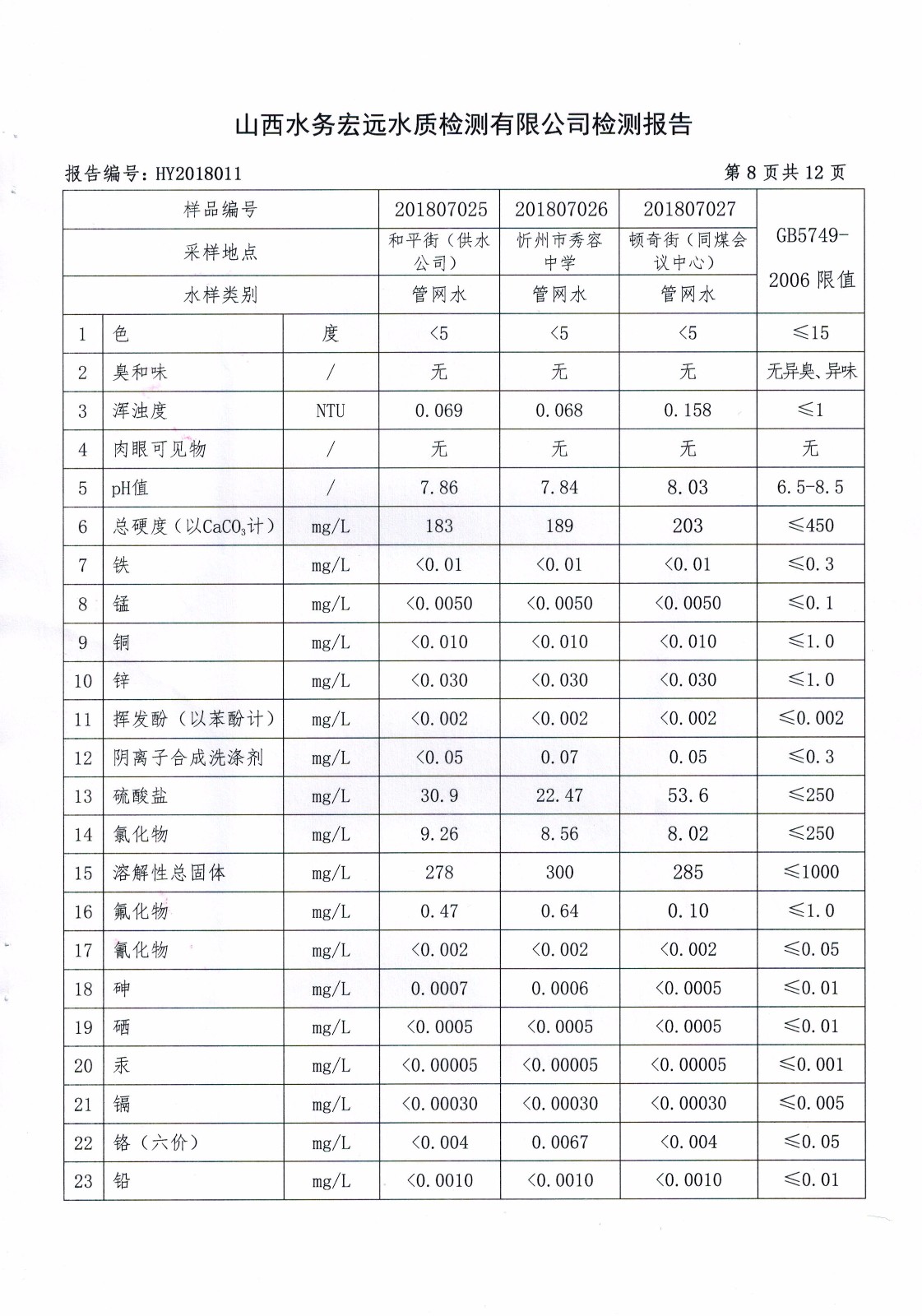 忻州城區(qū)公共供水水源水、出廠水、管網水、管網末梢水2018年7月份水質信息公示
