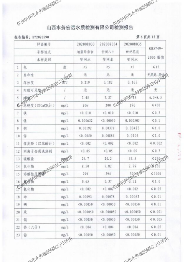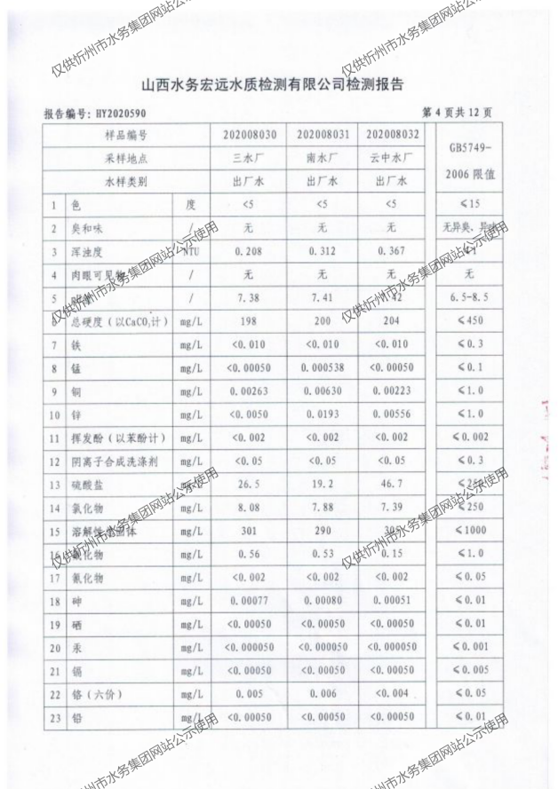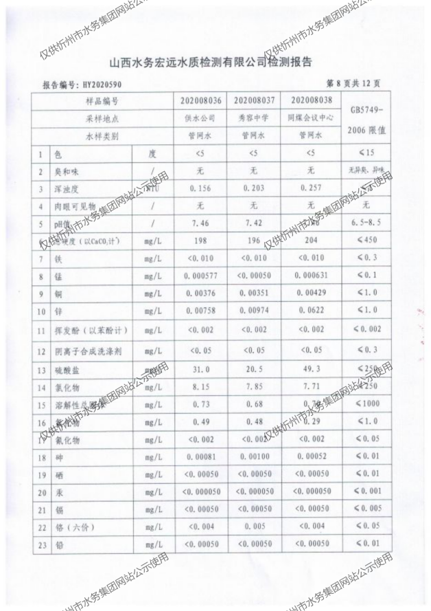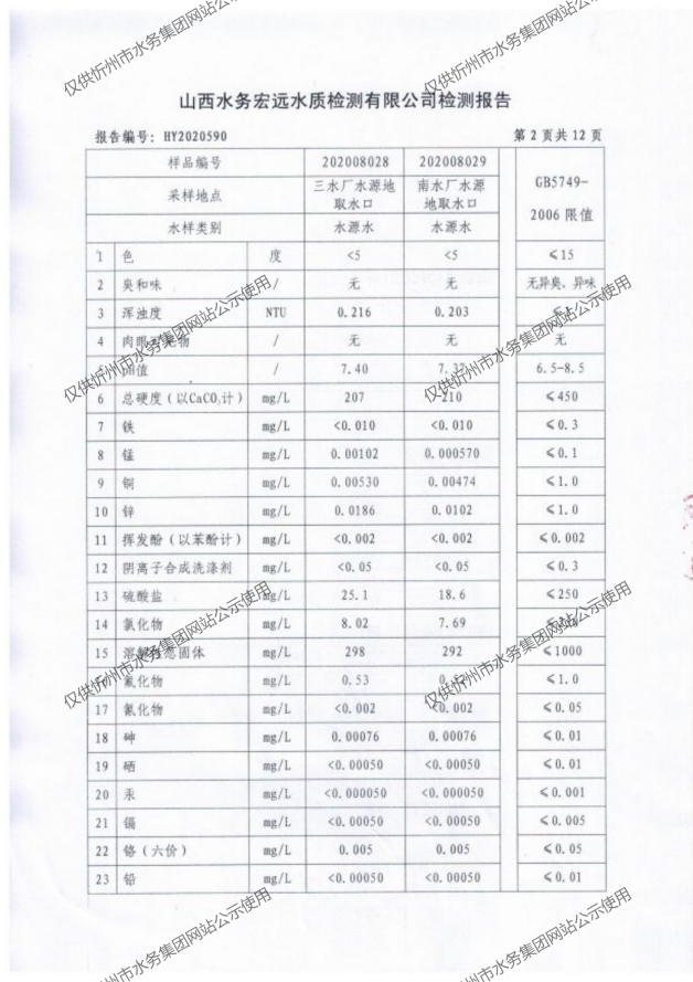 忻州城區(qū)公共供水水源水、出廠(chǎng)水、管網(wǎng)水、管網(wǎng)末梢水2020年8月份水質(zhì)信息公示
