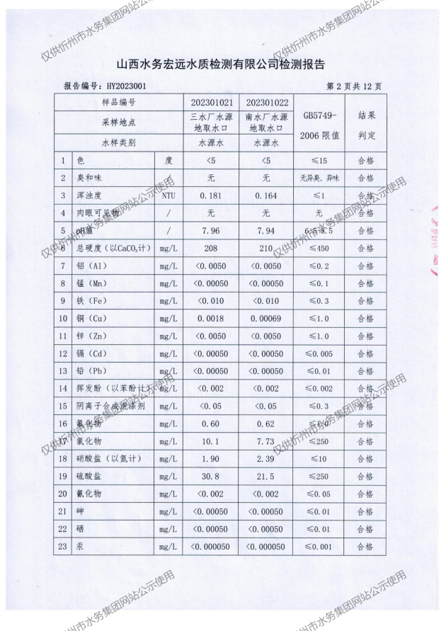 忻州城區(qū)公共供水水源水、出廠水、管網水、管網末梢水2023年1月份水質信息公示